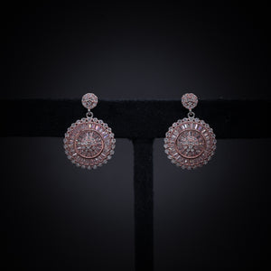 Made with 92.5 sterling silver and finished with a luxurious rose gold plating, these earrings radiate sophistication and charm. The design is embellished with high-quality sparkling stones, arranged in a dazzling circular pattern that catches the light beautifully, making them the perfect accessory for weddings, parties, and festive celebrations.