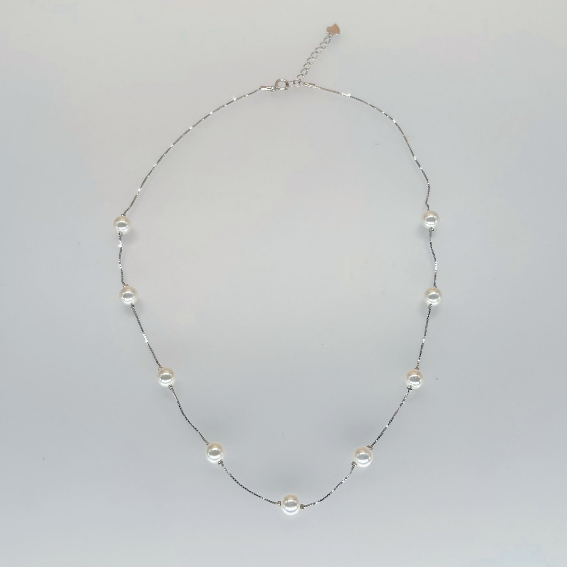 Elevate your elegance with this Classic Pearl Symphony Necklace, a timeless blend of sophistication and luxury. Featuring lustrous pearl moti gracefully spaced along a sleek Italian 92.5 sterling silver chain, this necklace captures the essence of refined beauty. Perfect for both everyday grace and special occasions, its minimalist yet luxurious design makes it a jewelry-box essential.