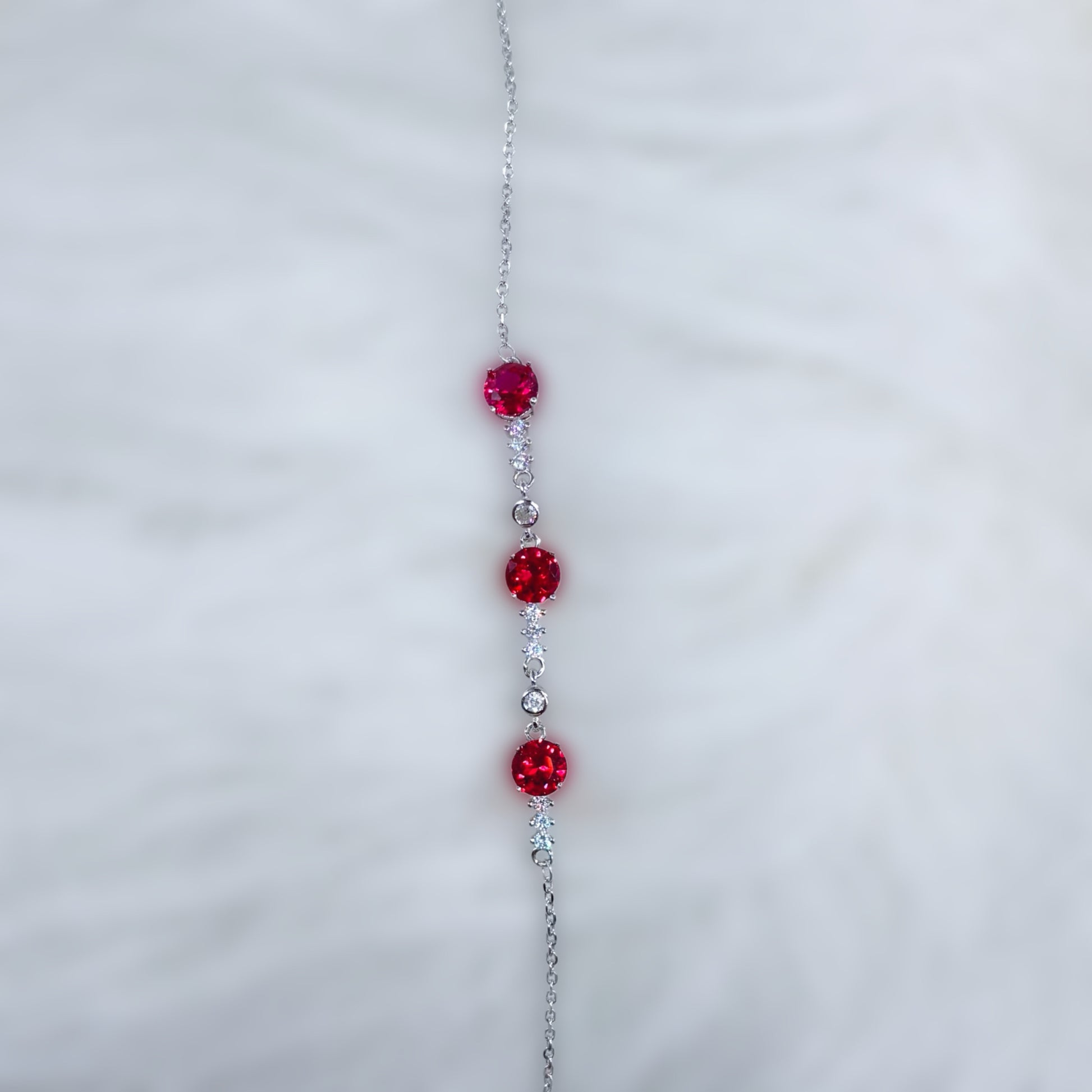 Step into the world of refined elegance with the Crimson Radiance Trilogy Bracelet, crafted from authentic Italian 92.5 sterling silver. This stunning masterpiece features three brilliant round-cut ruby red CZ stones, each surrounded by sparkling clusters of white CZ diamonds. The vibrant red center stones and dazzling accents create a high-end, luxurious appeal—perfect for any occasion.