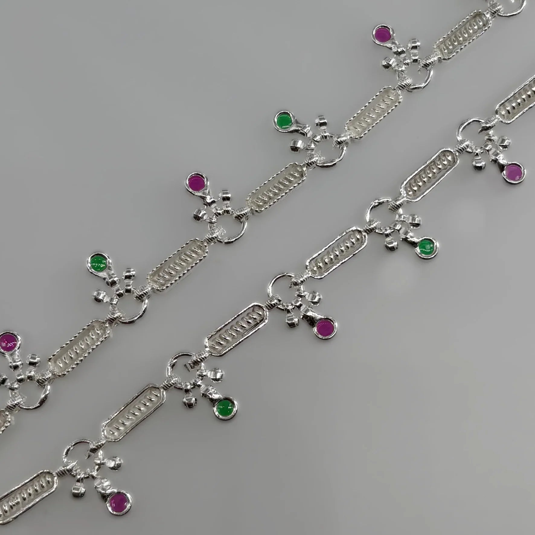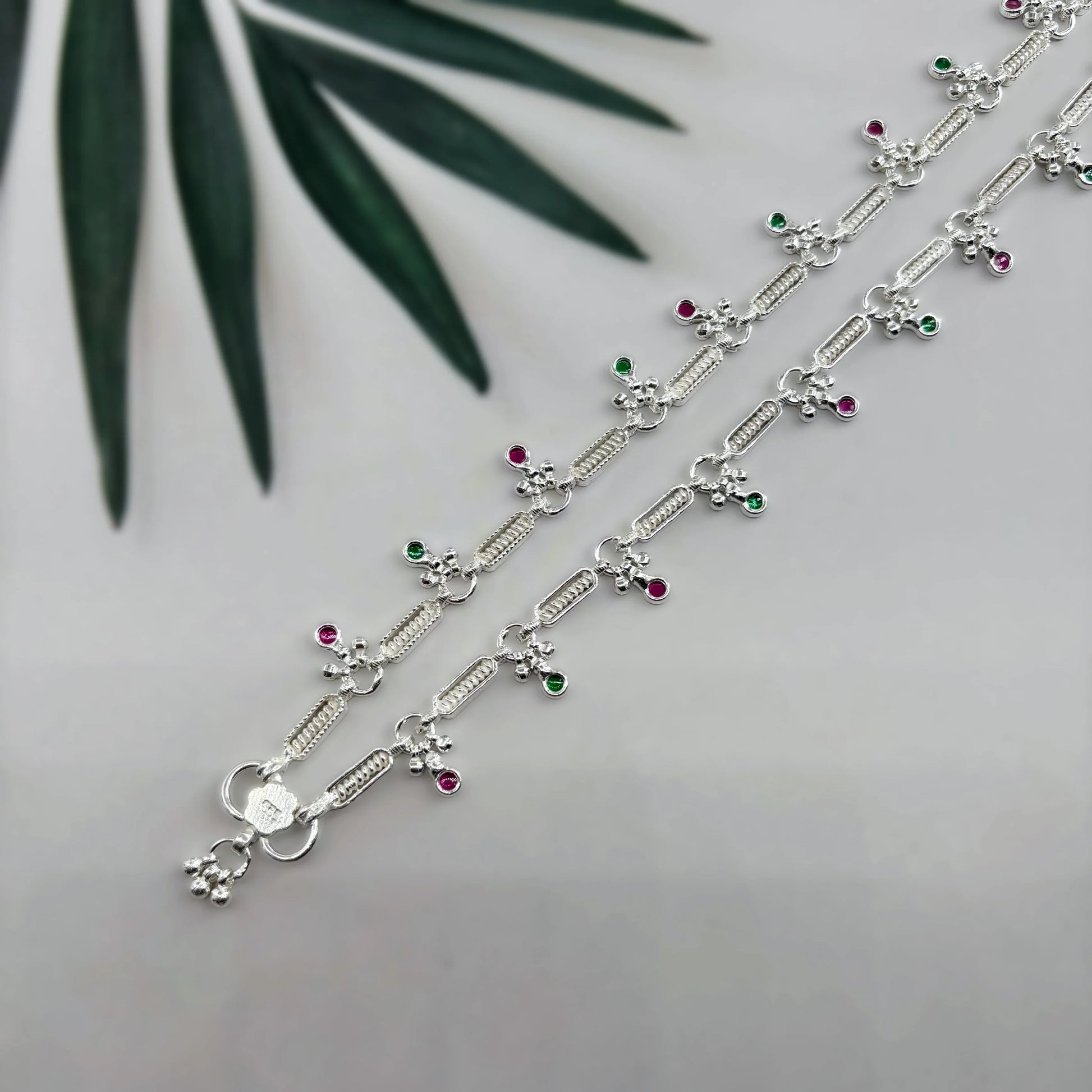 Add grace to your steps with this handmade oxidised silver anklet (payal), meticulously crafted from 92.5 sterling silver. The anklet features delicate cut stone embellishments in green and red, adding a vibrant yet traditional charm. With an antique oxidised finish, this 10-inch anklet perfectly blends cultural artistry with timeless elegance.