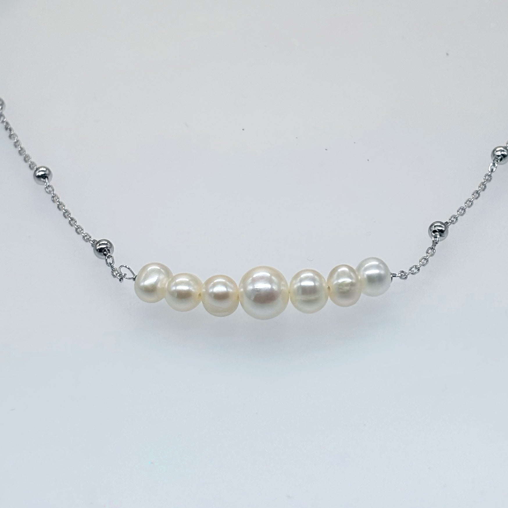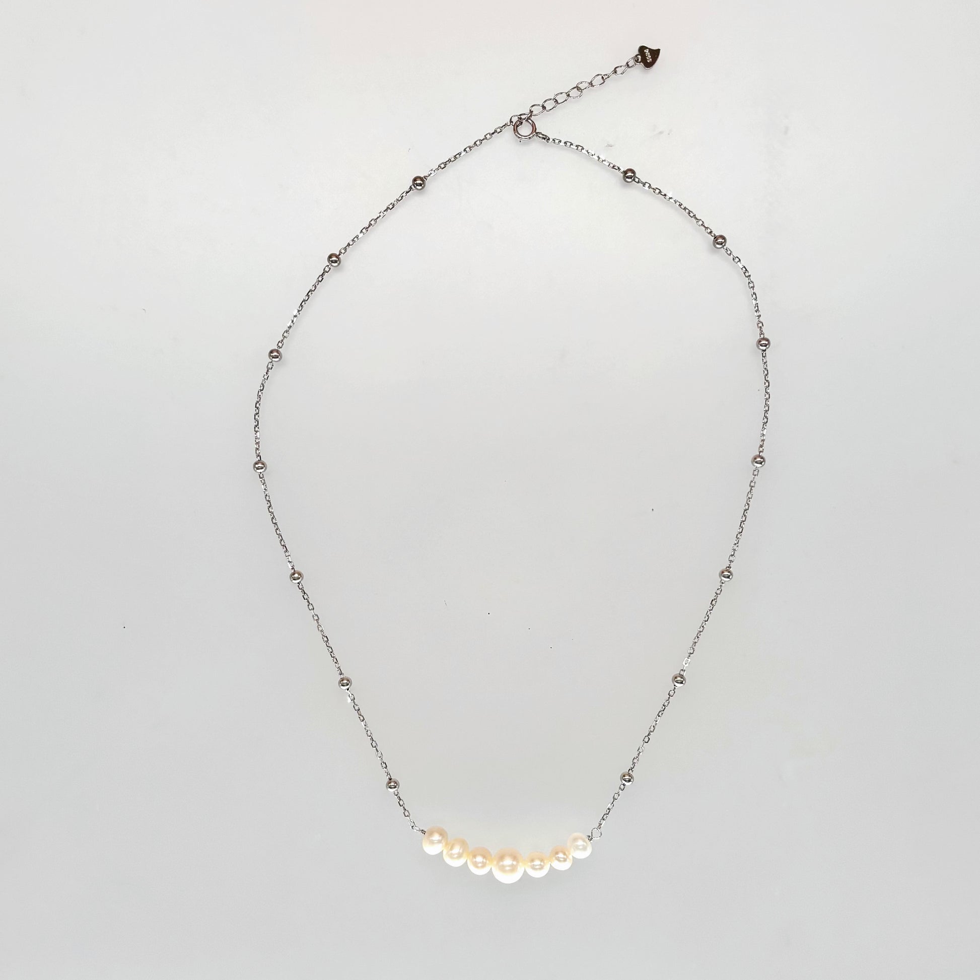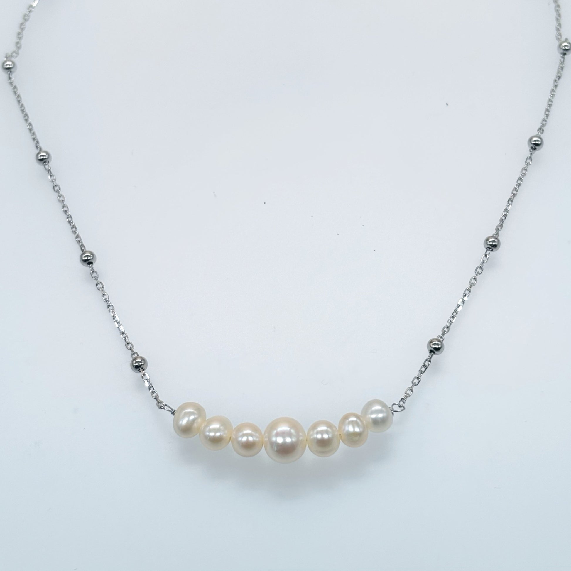 A graceful blend of purity and sophistication, this luxury necklace features a beautiful gradient of natural pearls (moti) set on a sleek Italian 92.5 sterling silver chain with delicate silver beads. Perfectly balanced for daily elegance or premium occasions, it radiates timeless charm and modern finesse.