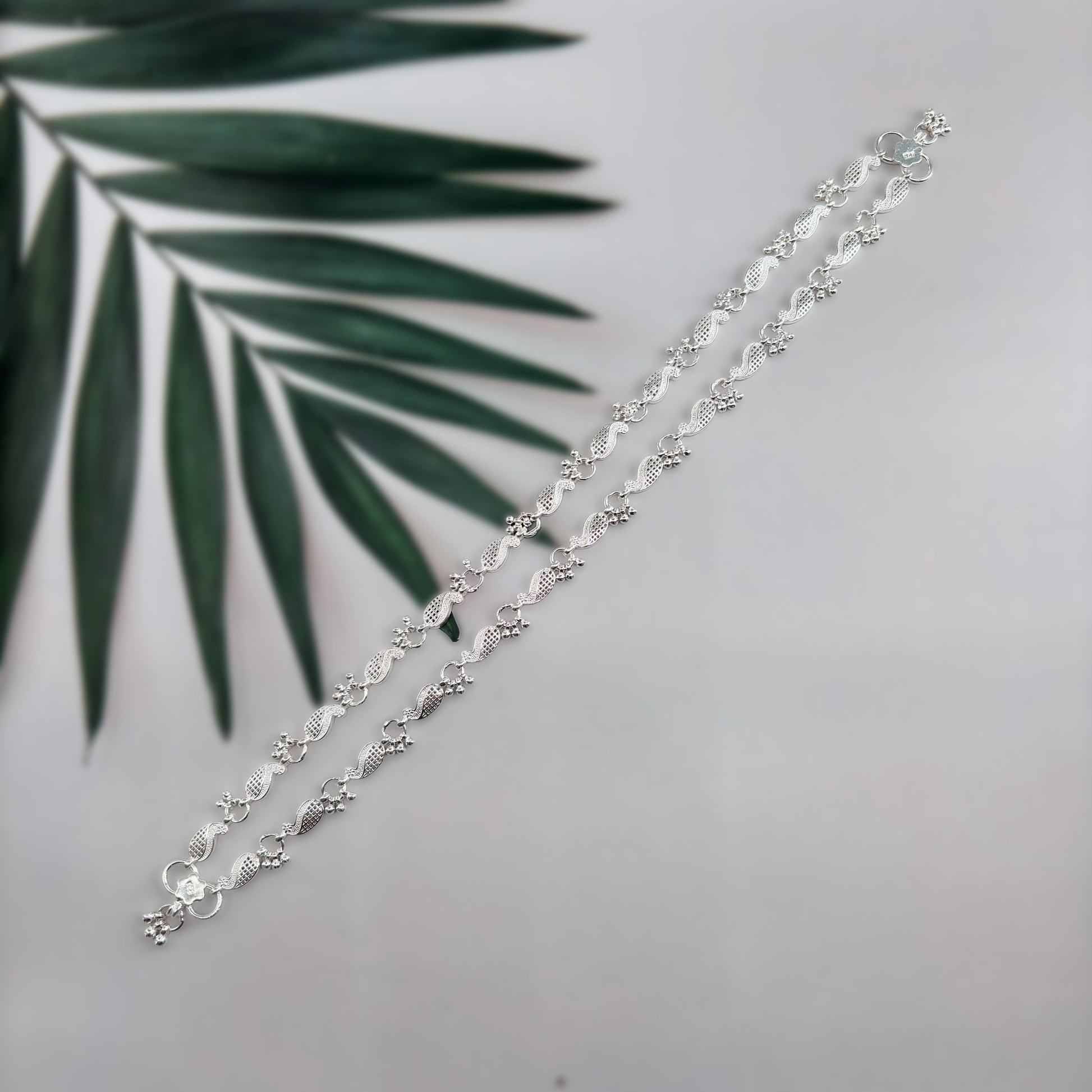 Grace your ankles with this leaf motif silver payal (anklet), beautifully crafted in 92.5 sterling silver. Its delicate leaf-inspired design combined with tiny dangling accents brings a touch of elegance and tradition, making it ideal for both daily wear and festive occasions.