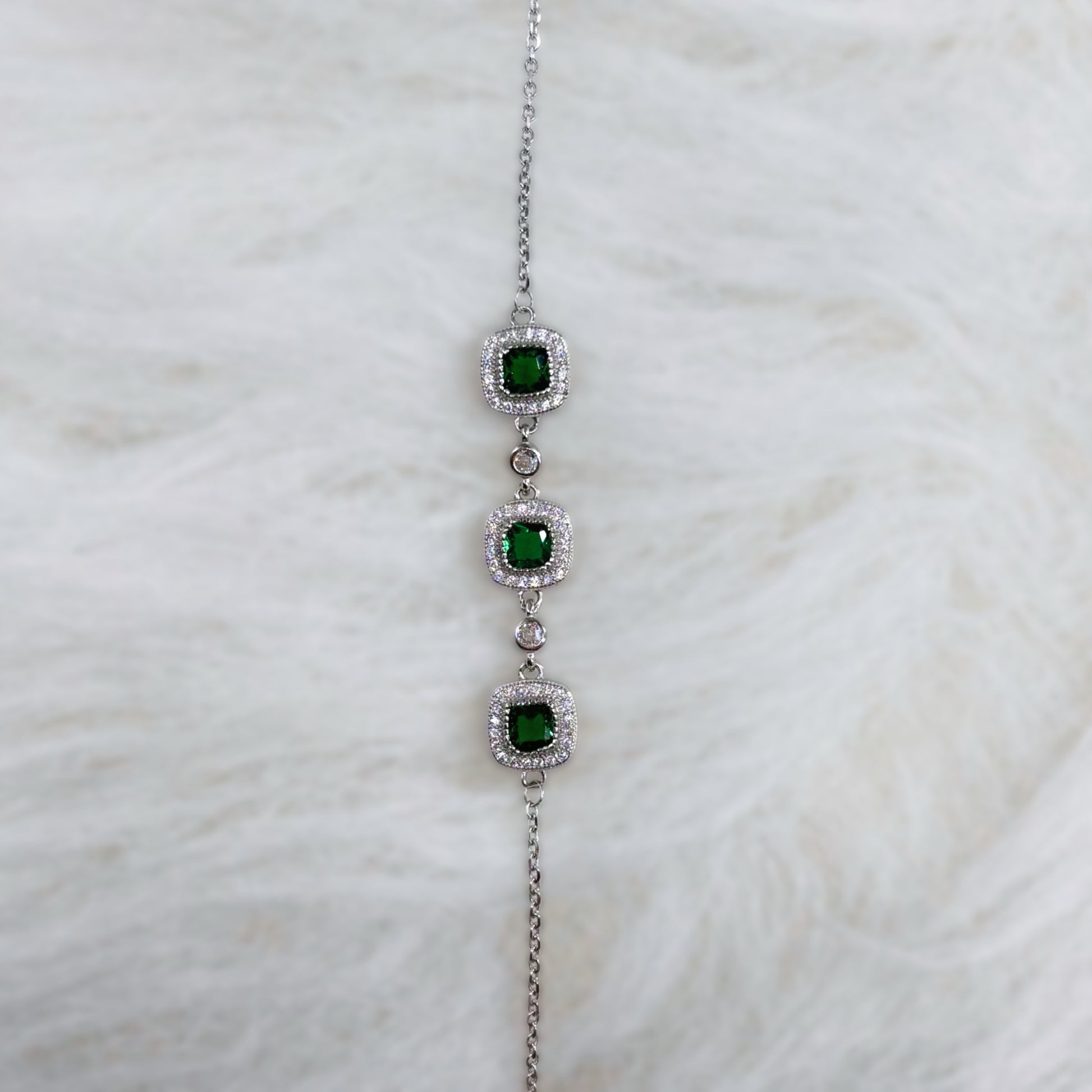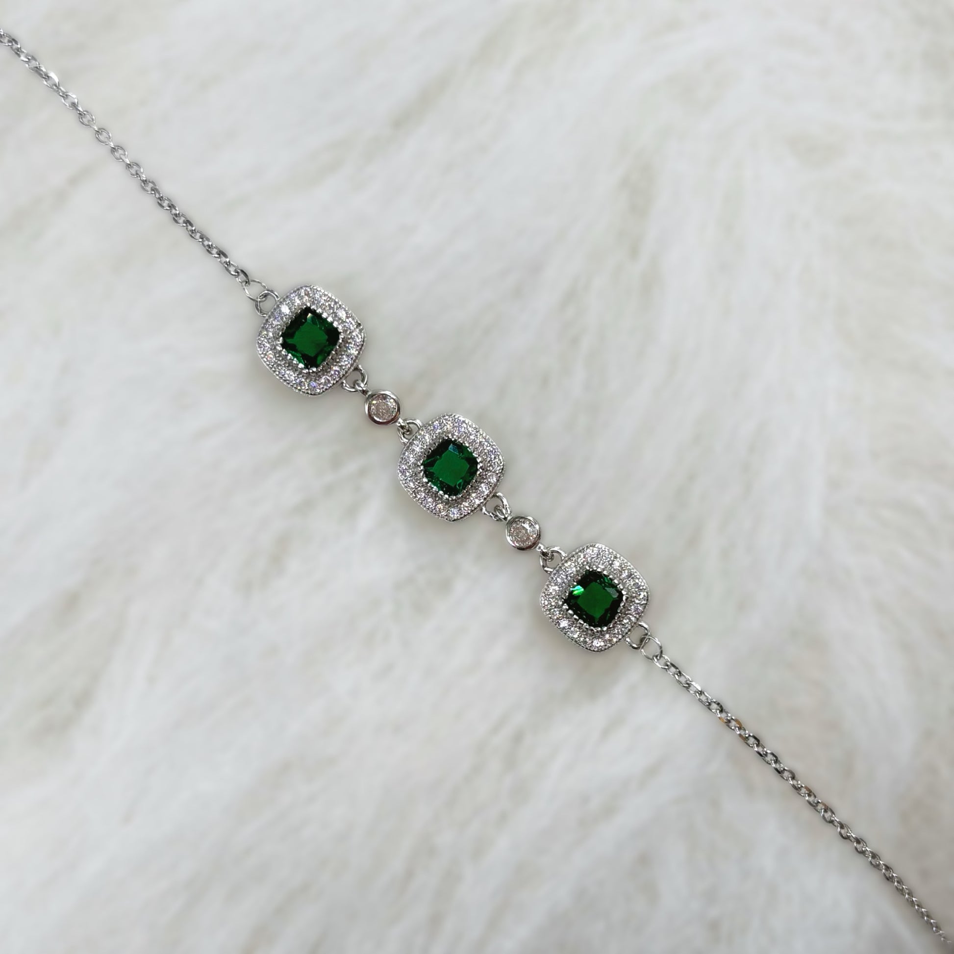 Indulge in pure elegance with the Emerald Majesty Cushion-Cut Bracelet, crafted to perfection in authentic Italian 92.5 sterling silver. This luxurious piece features three radiant cushion-cut emerald green CZ stones, each encased in a shimmering double-halo of micro CZ diamonds. The brilliance, the detailing, and the premium finish make this bracelet a true statement of sophistication.