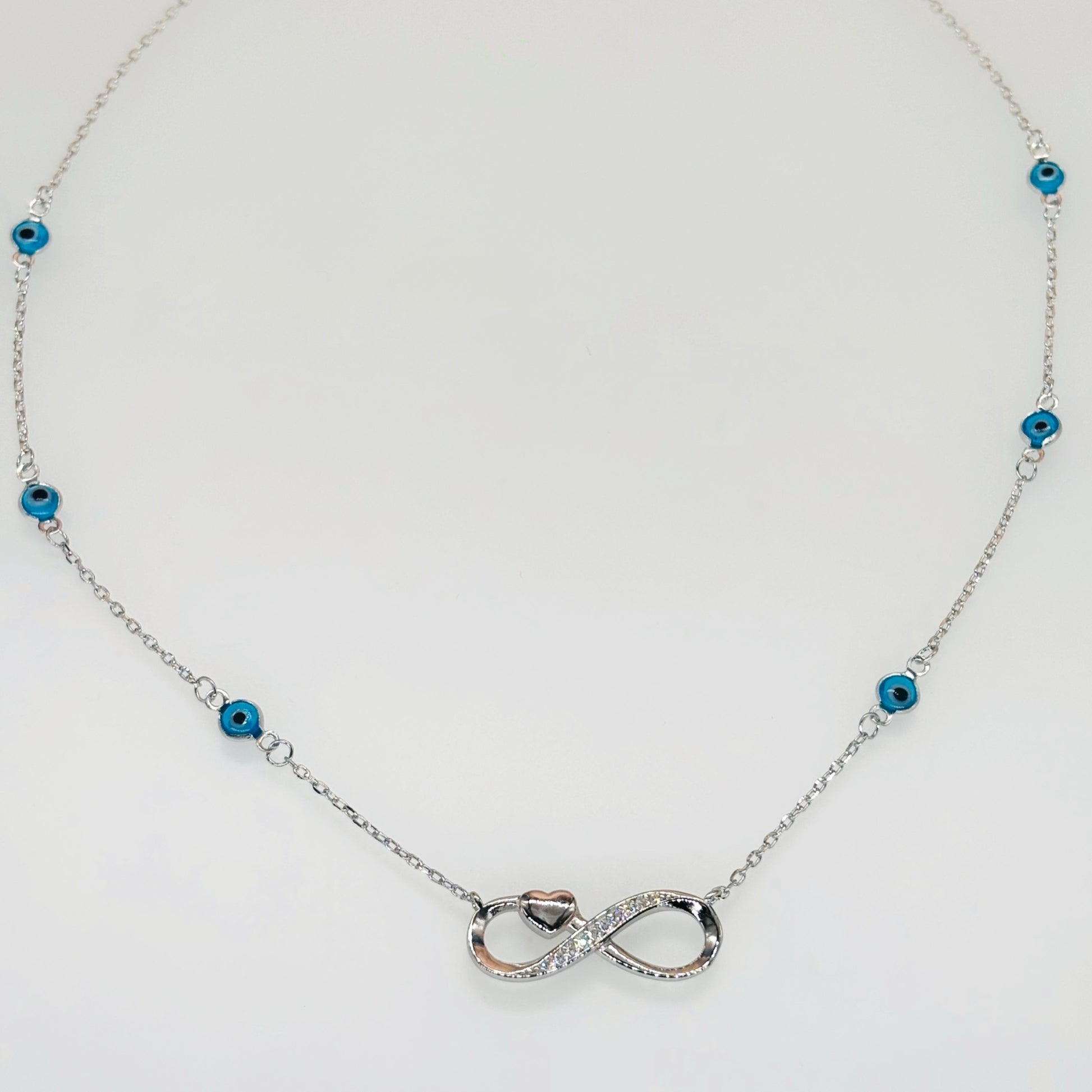 Embrace eternal elegance and protection with this stunning Infinity Heart Necklace, crafted from Italian 92.5 sterling silver. Adorned with shimmering Cubic Zirconia (CZ) stones and blue evil-eye charms, this design perfectly symbolizes infinite love and positivity — a stylish statement of grace and meaning.