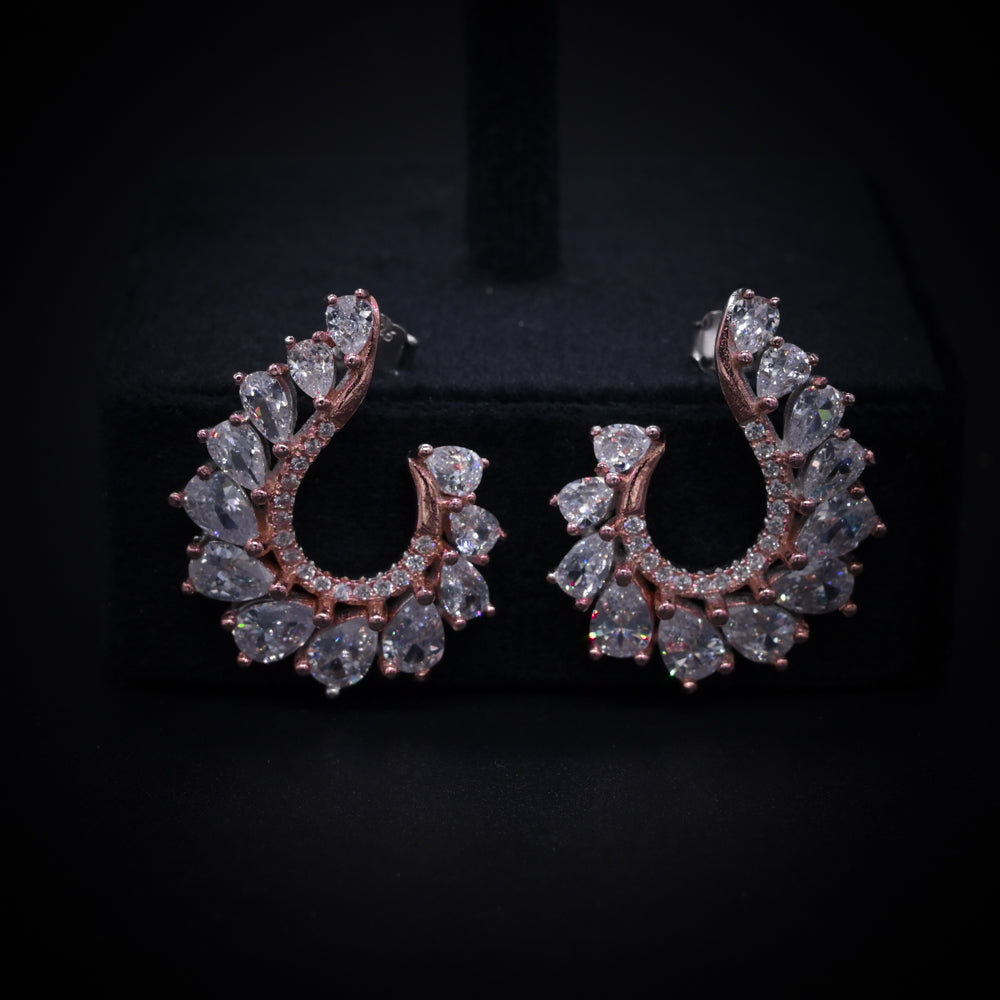 “Royal Aurora Rose Gold Crescent Earrings – Italian 92.5 Silver with Pear-Cut CZ Brilliance”