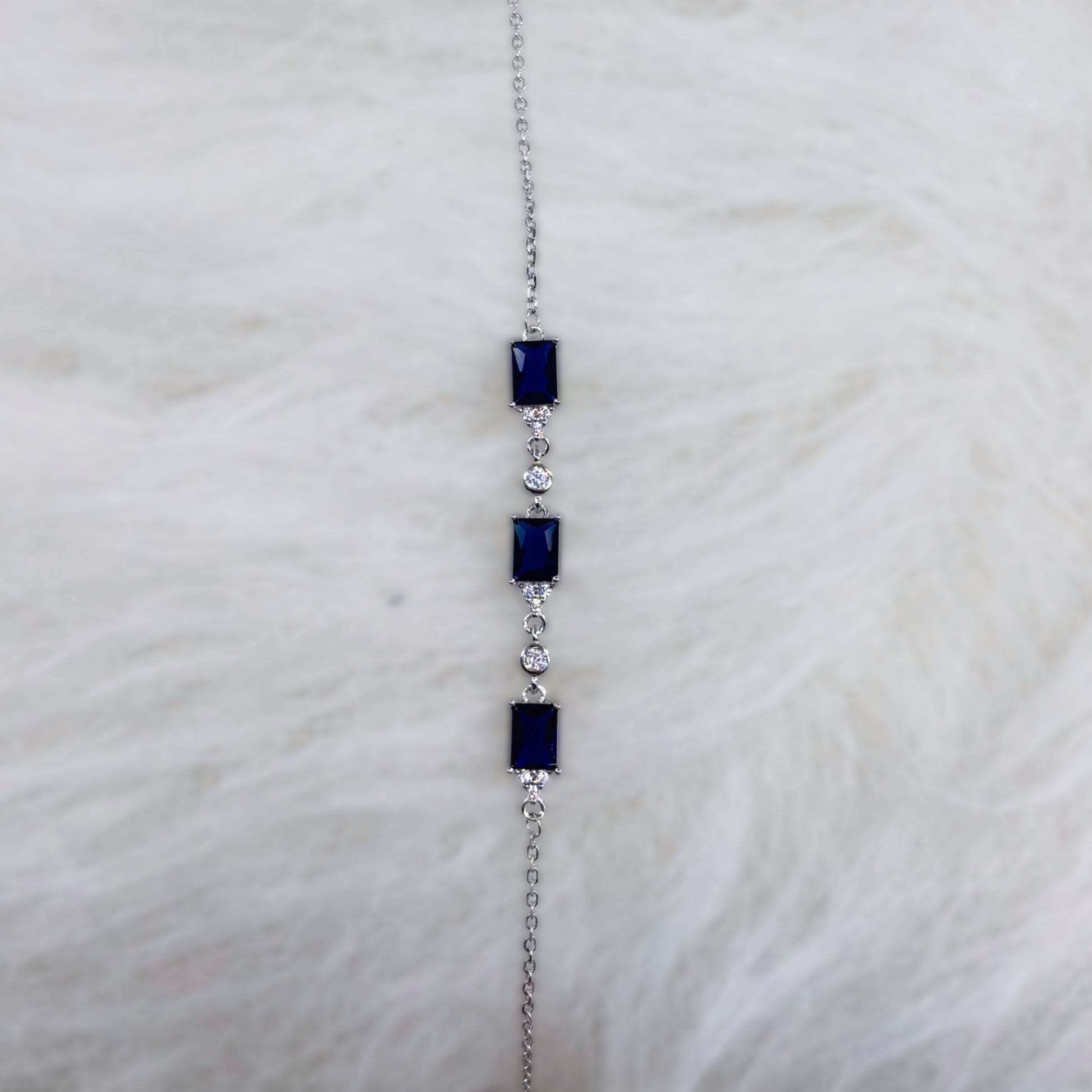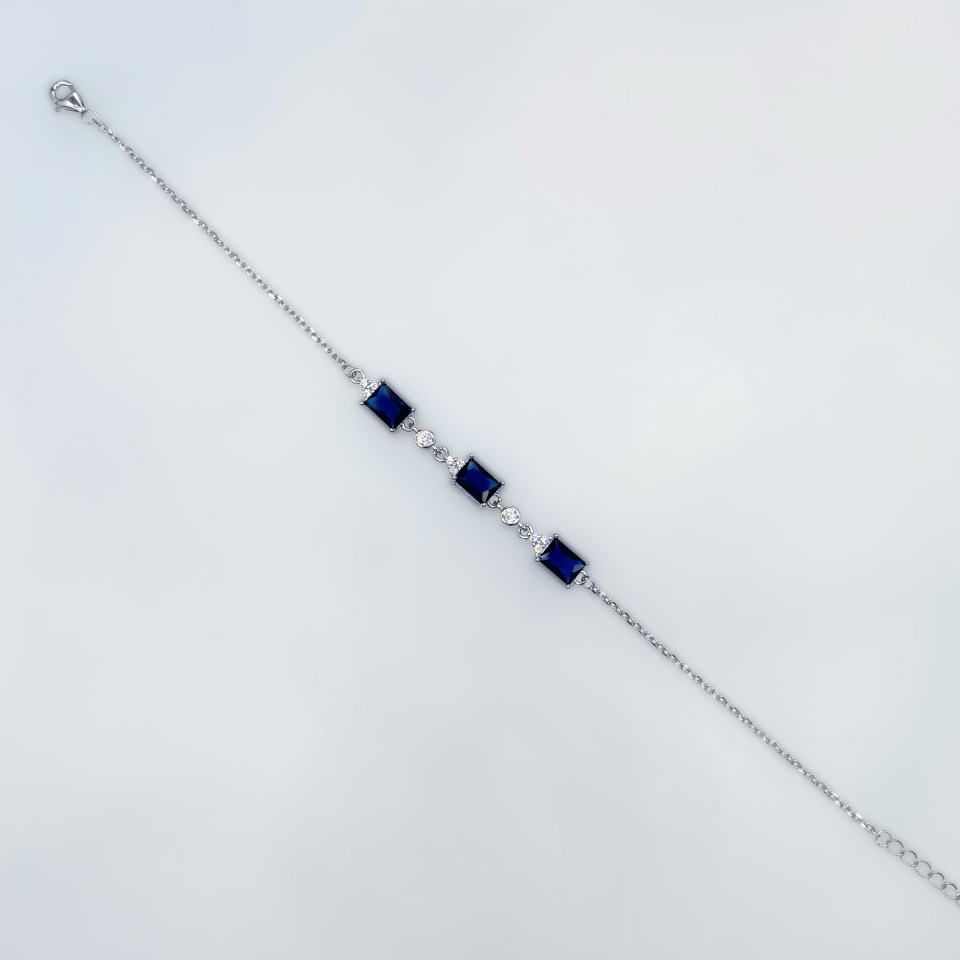 Experience timeless sophistication with this Royal Sapphire Emerald-Cut Bracelet, exquisitely crafted in authentic Italian 92.5 sterling silver. Featuring three rich navy sapphire-toned emerald-cut CZ stones, perfectly aligned and highlighted with brilliant round CZ accents, this bracelet exudes elegance, luxury, and modern refinement.